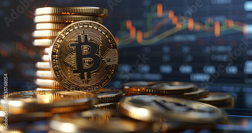 Bitcoin stacks shine on a digital trading background showcasing price fluctuations and market trends, representing the growing influence of cryptocurrency in finance