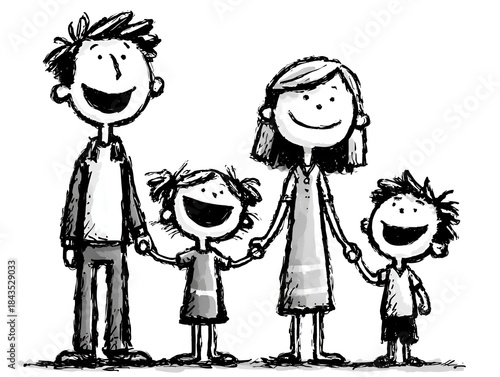 Black and white cartoon drawing of a happy family with mom, dad, son, and daughter holding hands and smiling joyfully together at home.