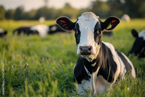 Black and White Cow in a Green Meadow with Cows Resting in the Background