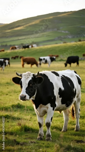 cow, pastoral, field, grazing, black-and-white, cattle, rural, landscape, grass, herd, animal, farm, nature, peaceful, agriculture, farm animal, hillside, daylight, meadow, cow, dairy, black, milk, white, pasture, green, farming, calf, beef, animal, standing, farmland
