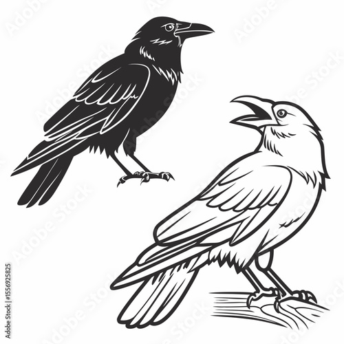 crow, raven, bird, black, white, silhouette, graphic, illustration, drawing, outline, perched, wing, feather, claw, tree branch, nature, animal, wildlife, symbol, design, art, graphic design, digital artwork, isolated