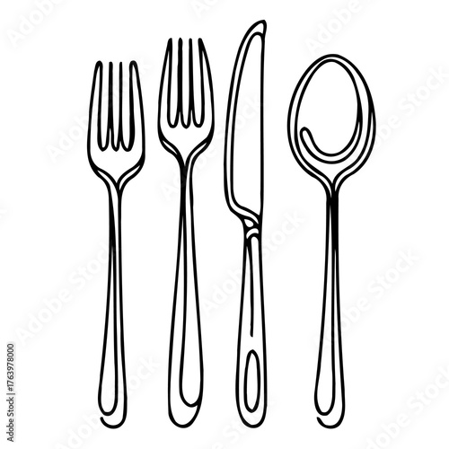 cutlery, fork, spoon, knife, utensil, dining, kitchen utensile, tableware, eating, flatware, silverware, meal, food, cooking, food preparation, kitchen, household goods, dinnerware, cookware, serving, table setting, eatery, cafes, chef, dinner, breakfast, lunch, menu, hand-drawn, vignetting, pencil drawing, drawing, illustration, outline, line art, doodle, greyscale, simple, minimalist, classic, engraving, etching