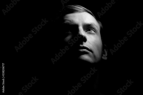 emotion, face, people, portrait, dramatic, black, 1, expression, man, dark, pensive, male, adult, person, background, light, profile, serious, white, shadow, young, shirt, calm, lifestyle, black background, side, facial, human, mysterious, bw, feeling, youth, low, meditative, space, casual attire, key, caucasian, attractive, charismatic, eye, mystery, closeup, suit, photo, photogenic, confident, guy, smart, head