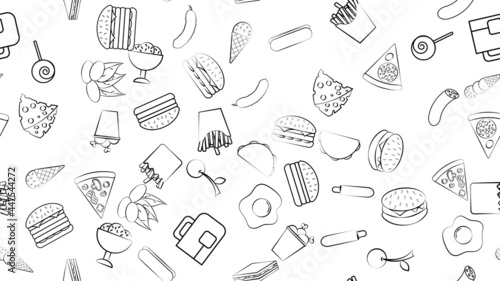 Black and white endless seamless pattern of food and snack items icons set for restaurant bar cafe: burger, nuts, egg, sausage, ice cream, pizza, burrito, candy, tea. The background
