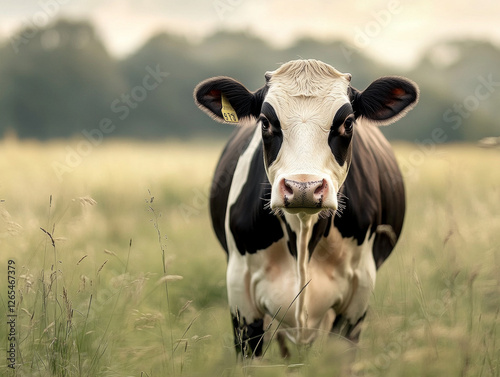 Black and White Holstein Cow Grazing in a Lush Field During Twilight