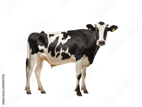 Black and white Holstein cow standing, showcasing its distinctive markings, ideal for illustrating dairy farming or agricultural themes on transparent background