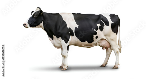 Black and white Holstein dairy cow isolated on white background, side view with visible udder, representing livestock farming, milk production, agriculture, and dairy industry.