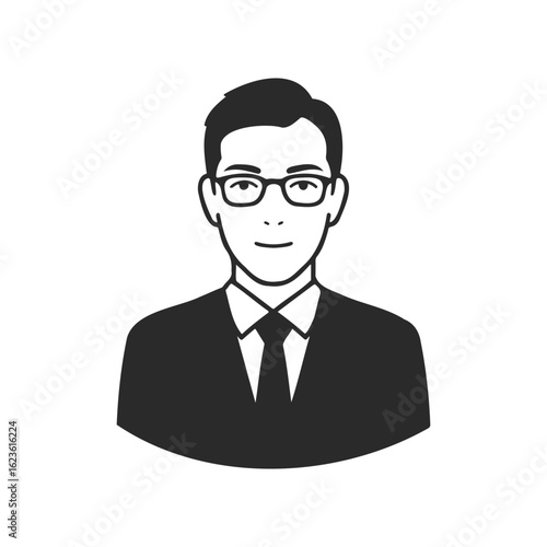 Black and white illustration of young asian male in suit and glasses