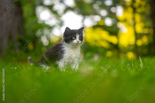 adorable, animal, baby animal, backyard, black, cat, cute, felino, forest, greengrass, hair, kitten, cat, long, long-haired, mammal, nature, outdoors, pet, sunset, tree, white, wood, yard