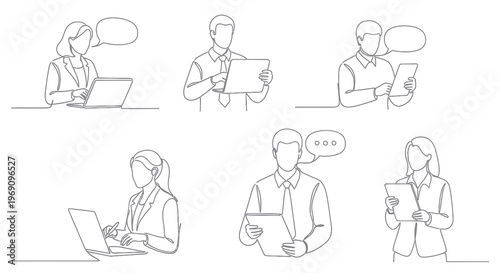 miscellaneous, business, people, line art, illustration, vector, office, woman, man, laptop, tablet, computer, technology, work, communication, meeting, online, digital, education, professional, success, strategy, analysis, marketing, finance, corporate, career, team, discussion, brainstorming, presentation, information, cognition, learning, document, report, datum, project, task, planning, innovation, startup, growth, development, partnership, connection, office worker, executive