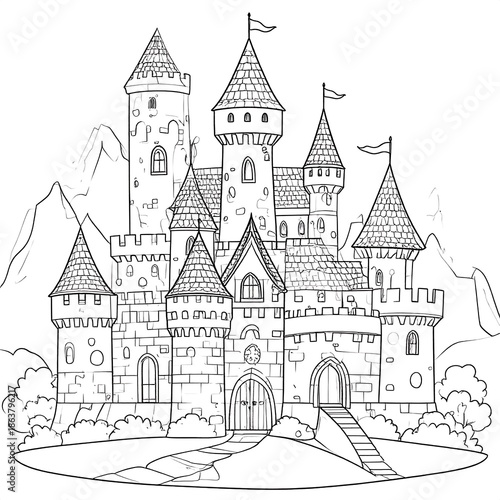 castle, turret, flag, mountain, fantasy, royalty, story, fairy tale, king, queen, princess, kingdom, stone, fortress, mediaeval, tower, drawbridge, gate, battlement, landscape, illustration, architecture, vignetting, outline, colouring, page, art, building, structure, design, wall, window, door, stair, path, garden, tree, bush, background, hill, peak, majestic, elaborate, detailed, grand, exterior, adventure, magic
