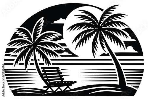 beach, tropical, palm, tree, chair, lounge, ocean, sea, water, wave, sand, sun, moon, sky, cloud, silhouette, black, white, graphic, vector, illustration, minimalist, simple, clean, vacation, travel, relaxation, summer, nature, landscape, scene, design, element, icon, symbol, art, drawing, isolated, pattern, retro, vintage, holiday, paradise, island, coastal