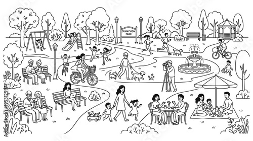 park, people, activity, recreation, leisure, tree, fountain, walk, cycle, picnic, play, relax, city, urban, garden, bench, path, grass, family, friends, pet, dog, healthy, lifestyle, nature, environment, illustration, vector, cartoon, graphic, design, community, social, interaction, exercise, fun, enjoyment, day, fresh, air, space, gathering, outline, vignetting, drawing, monochrome