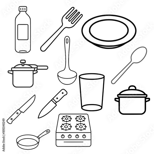 Black and white outline icons depicting kitchen utensils and cookware. Includes a bottle, fork, plate