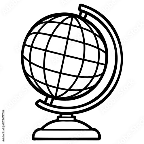 Black and white outline illustration of a globe on a stand, representing geography and education