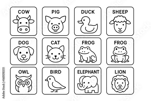 animal, outline, farm, wildlife, label, cow, pig, duck, sheep, dog, cat, frog, owl, bird, elephant, lion, black, white, cartoon, simple, icon, square, illustration, drawing, grid, set, character, nature, design, domestic, wild, collection, minimal, vector, icon