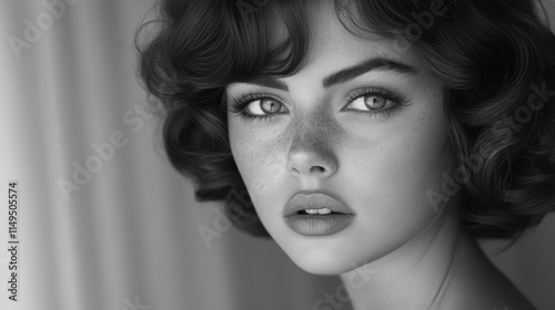 woman, portrait, black, white, monochrome, beauty, model, face, eye, hair, curl, freckle, lip, skin, closeup, vintage, retro, style, elegant, fashion, classic, expression, gaze, shoulder, curtain, background, shadow, light, texture, artistic