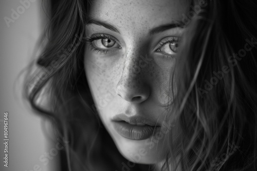 portrait, black-and-white, woman, freckle, wavy hair, closeup, pensive, gaze, artistic, photo, expressive, natural beauty, serious, soft focus, moody, contemplative, emotional, intense, human face, feature, beauty, serene, depth, classic, monochrome, introspective, vintage, nostalgia, minimal