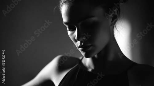 Black and white portrait of a young woman with dramatic lighting creating shadows on her face and highlighting her delicate features, conveying a sense of introspection and quiet contemplation