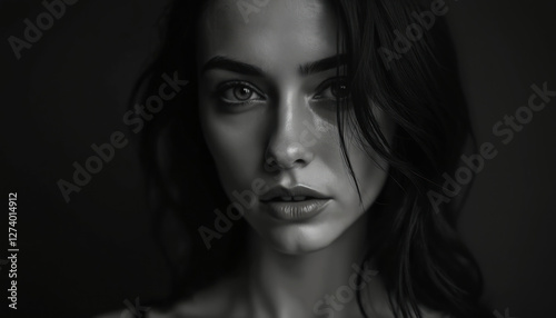 black, white, photo, woman, portrait, caucasian, ethnicity, adult, young, beauty, looking, camera, studio, shot, sensuality, closeup, long, hair, fashion, model, female, background, cute, lifestyle, brown, blond, human, face, elegance, indoor, casual attire, clothing, beautiful, people, real, confidence, dark, glamour, femininity, head shot, ai, generative, sensual, attractive, posing, monochrome, monochromatic, greyscale, one person, person