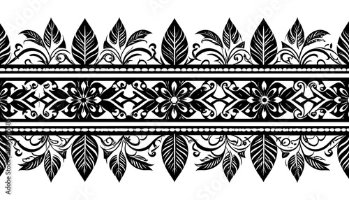 Black and white symmetrical decorative border featuring floral and leaf elements with intricate, stylized detailing