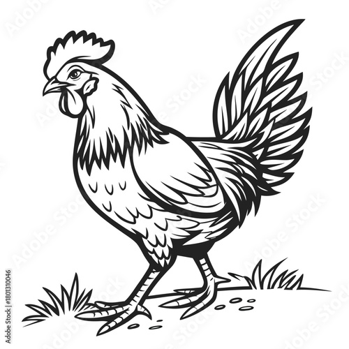 Black and white vintage rooster is standing elegantly on grass in a vector