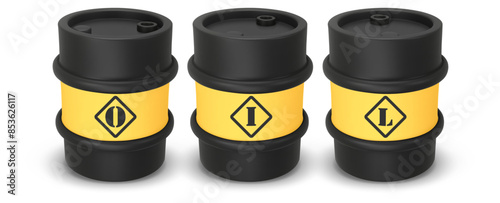 Black and yellow round metal drums. 3D rendering. Vector illustration isolated on white. Barrel of oil. Dangerous chemical liquids, flammable gases, waste. Oil Industry, Petrol Sign