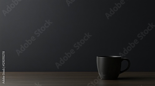 Black background with coffee cup on table, minimalistic style. Dark grey wall for product presentation mock up. Copy space banner. Mockup template. Black color