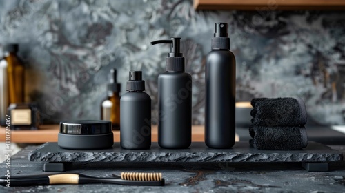 black, beauty, product, slate, shelf, minimalist, style, modern, bathroom, spa, bottle, container, spray, pump, lid, cap, towel, dark, grey, marble, background, grooming, man, luxury, clean, simple, organised, aesthetic, design, smooth, matte, surface, composition, photo, still, life, brush, wood
