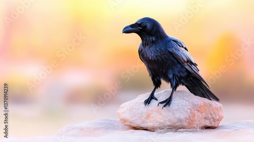 bird, raven, black, rock, perched, sunrise, sunset, nature, wildlife, animal, photo, closeup, detail, shadow, feather, wing, beak, eye, silhouette, sky, horizon, light, colours, gold, orange, brown, stone, landscape, environment, conservation, forest, morning, evening, shadowy, contrast, composition, sharp, sharpened, texture, avian, dark, beauty, ornithology, species, photographic