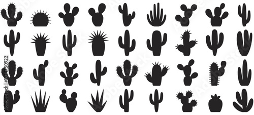Black Cactus Silhouettes, Diverse Shapes and Sizes, isolated on white background, desert plant icons, botanical collection, minimalist vector illustrations, ideal for wallpaper, wrapping paper