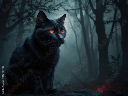 cat, black, forest, dark, mystical, eye, glowing, red, glow, distance, night, tree, silhouette, wildlife, nature, fantasy, magic, creepy, shadow, fog, haunting, eerie, mystery, felino, animal, creature, wild, mythical, spirit, enchanted, dream, surreal, art, digital, artwork, illustration, painting, photo