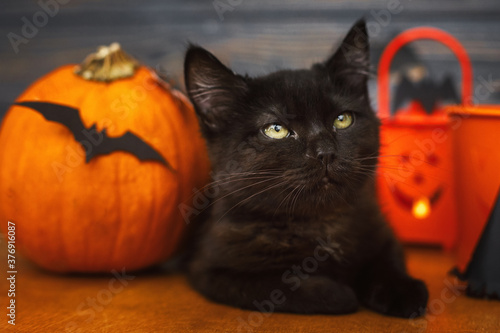 Black cat sitting at pumpkin and jack o lantern pail on dark wooden background with bats. Happy Halloween. Cute black kitten posing at holidays decorations, celebrating halloween at home