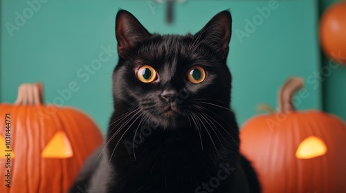 Black cat with bright eyes, surrounded by carved pumpkins, festive autumn scene.