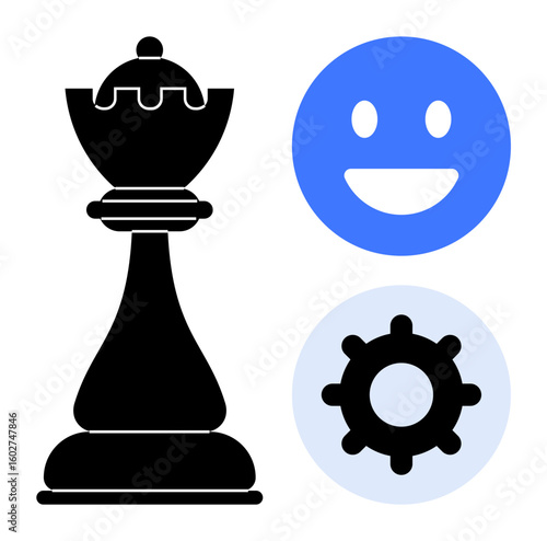 Black chess king, blue happy face, and gray gear represent strategy, teamwork, goal-setting, leadership, problem-solving, innovation. Ideal for business education productivity planning simple