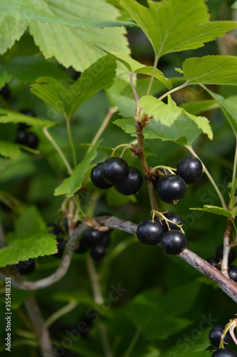Black currant (Ribes nigrum). Branch with green leaves and ripen berries.