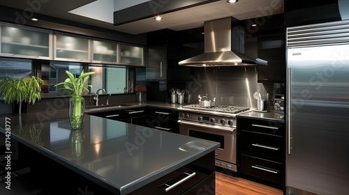black, dark, countertop, illustration, kitchen, granite, polished, elegance, modern, sleek, sophisticated, contemporary, contrast, light, cabinet, stainless, appliance, surface, design, interior, decor, stylish, luxurious, refined, chic, upscale, minimalistic, aesthetic, home, space