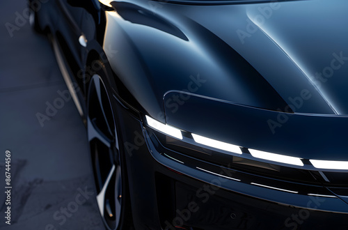 electric car, car, automobile, vehicle, headlamp, front, black, dusk, evening, night, light, illumination, detail, closeup, closeup, design, automotive, transportation, modern, futuristic, sleek, stylish, technology, innovation, future, drive, travel, road, street, parking, asphalt, pavement, line, white, dark, shadow, moody, dramatic, sustainable