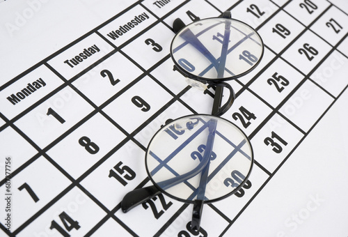 Black eyeglasses on calendar page close up. Planning business concept.