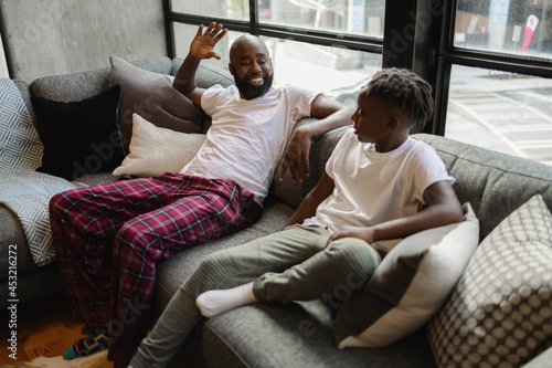 black, father, son, sitting, sofa, living, 10, 30s, 40s, adult, african american, beard, bonding, boy, brunette, children, comfortable, cool, couch, cushion, father, day, diversity, domestic life, dreadlocks, family, gesture, house, indoor, children, leisure, lifestyle, living room, male, mid, morning, pair, pajama, people, preteen, relax, to sit, smile, talk