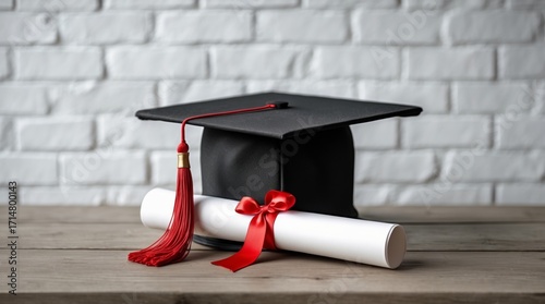 diploma, mortarboard, education, university, college, success, graduate, learning, student, certificate, scroll, red ribbon, brick wall, background, still life, accomplishment, milestone, cognition, formal, celebration, future, studying, triumph, black, grey, white