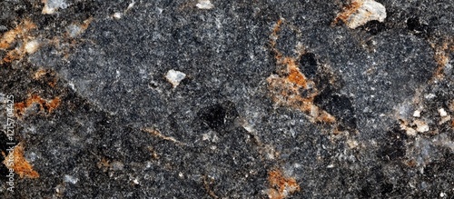 Black granite texture with flecks of orange and white minerals ideal for backgrounds and surfaces with Copy Space