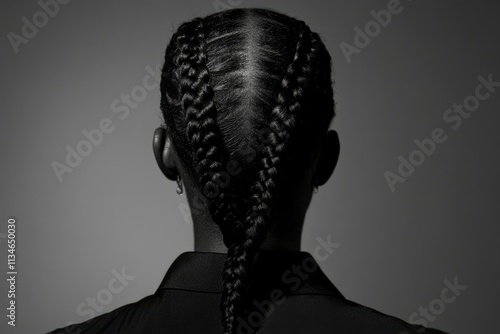 braid, hair, black, style, woman, female, model, fashion, beauty, coiffure, braided, long, dark, elegant, texture, glossy, shiny, neat, care, honed, professional, closeup, back, view, shoulder, neck, ear, clothing, monochrome, portrait, studio, photo, image, graphic, design, art, aesthetic, visual, contemporary