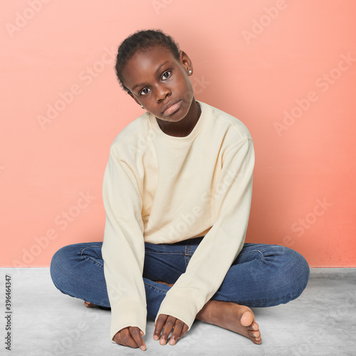 african american, beige, casual attire, children, clean, cream, denim, floor, full body, girl, grey, jean, jumper, children, minimal, neutral, orange, people, plain, product, simple, sitting, square, sweater, sweatshirt, young, youth