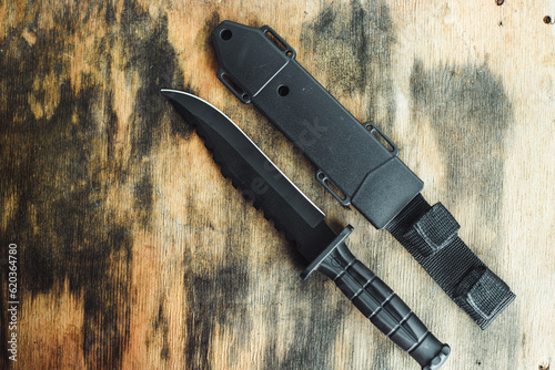Black knife. Hunting knife on a wooden background. Combat army knife made of high- quality stainless steel. Marine corps knife.