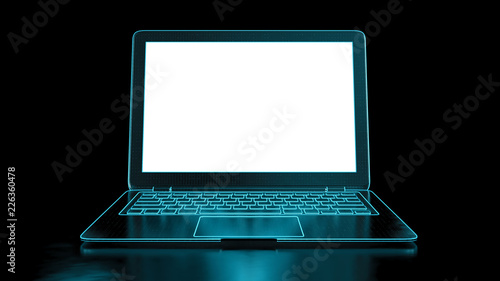 Black laptop with blue neon light on dark background. Notebook with empty blank screen. Computer technology and internet web communication concept. 3d Illustration