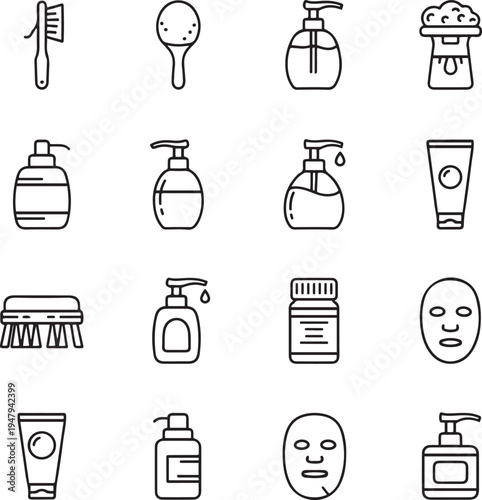beauty, hygiene, product, tool, toothbrush, sponge, lotion, cream, tube, face mask, jar, brush, black, line, various, white, background, collection, including, lotion, cream, tube, mask