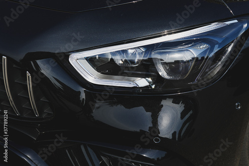 Black luxury sports car closeup. Modern LED headlights with lenses. Aggressive design. Car showroom. Closeup.