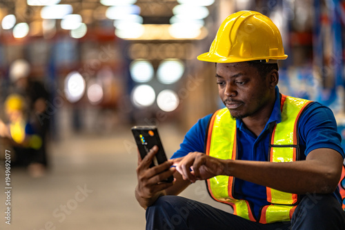 warehouse, logistic, supply, chain, men at work, employee, staff, man, man, black, african, american, smartphone, phone, mobile, technology, digital, app, cyberspace, network, communication, checking, using, typing, screen, industrial, industry, commercial, business, distribution, center, safety, helmet, hard hat, vest, uniform, modern, professional, factory, storehouse, freight, cargo, shipping, delivery, management, inventory, online, smart