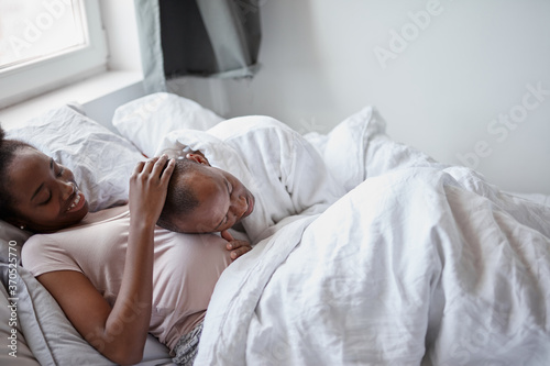 black man is listening to the stomach of his pregnant wife lying on bed in the morning